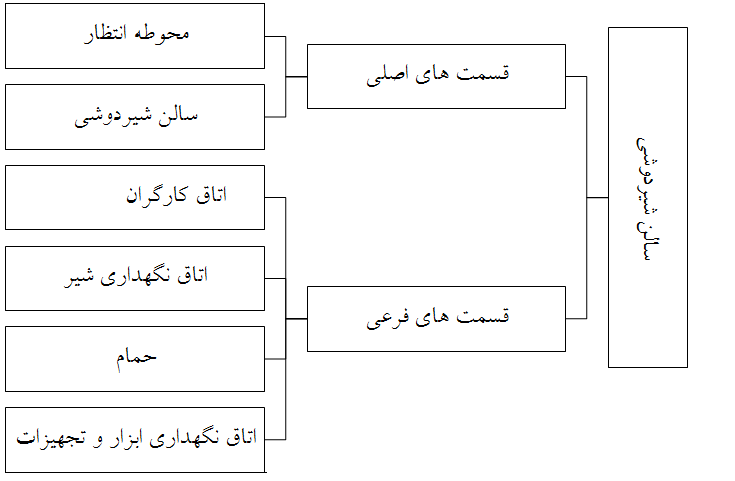همان طور که در شکل مقابل میبینید هر سالن شیر دوشی از دو قسمت اصلی و فرعی تشکیل میشود که قسمت اصلی شامل محوطه انتظار (Holding Area) و سالن شیر دوشی(Millking Parlor) میباشد و قسمت فرعی شامل اتاق کارگران، اتاق نگهداری شیر، حمام و اتاق نگهداری ابزار و تجهیزات (Utility Room) میباشد.