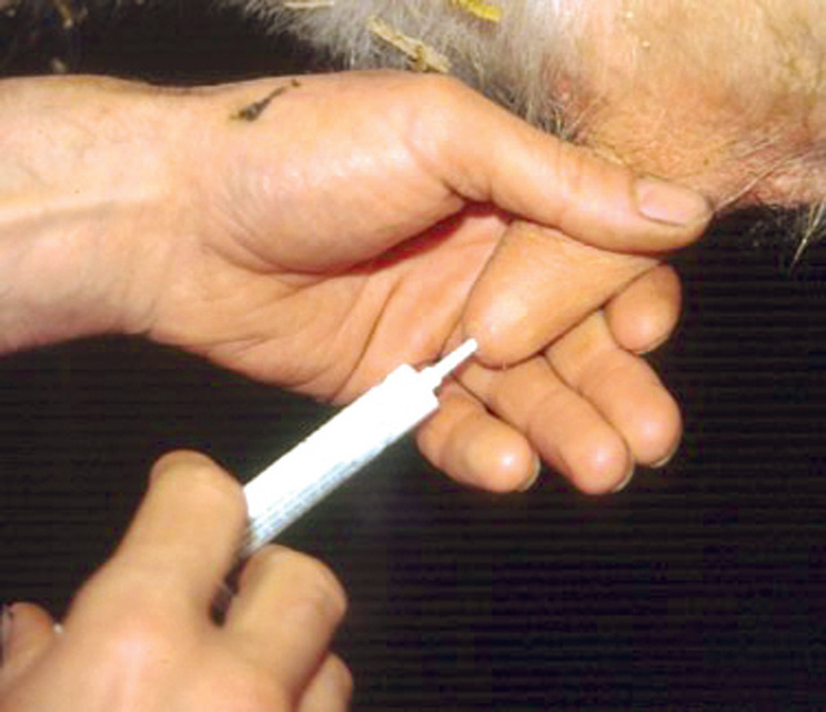4) کلاهک پماد پستانی را بر می داریم و آن را وارد سوراخ پستانک می کنیم